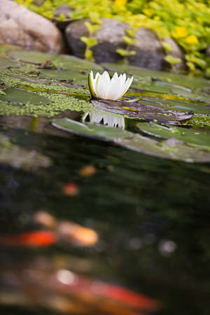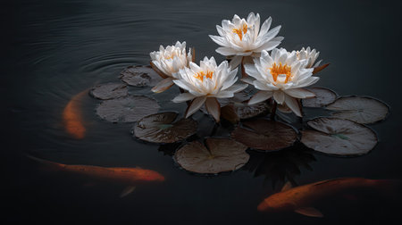 A tranquil pond scene featuring vibrant water lilies and koi fish swimming beneath the surface, captured during soft evening light, evoking calm and serenity.