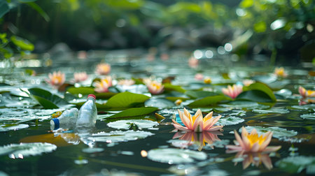 Peaceful lake reflects the morning light, dotted with pink flowers. Lush greenery frames the water, enhancing natures beauty. The atmosphere feels calm and inviting.