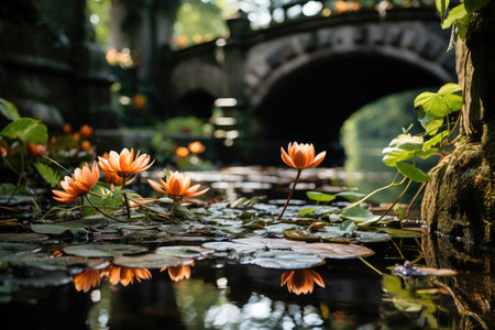 Renaissance: Lily emerges in serene waters between vibrant leaves and distant bridge., generative AI