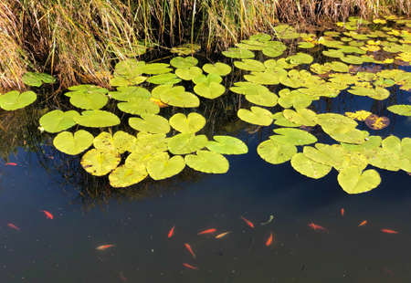 Koi carp, a flock of beautiful red fish in a pond, freshwater ecosystem, urban lakes