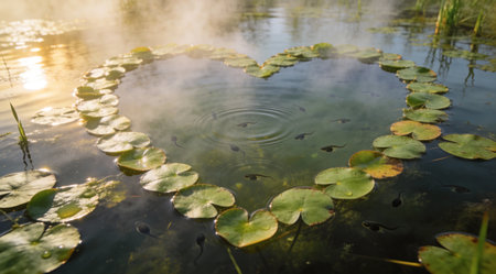 Cinematic view of a tranquil pond adorned with vibrant lily pads and reflective water surface