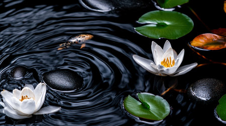 Smooth, dark pebbles cradle delicate water lilies while gentle ripples adorn the tranquil surface. Soft light illuminates the scene, creating an inviting atmosphere of calm and beauty.