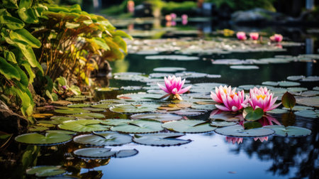 In a tranquil summer afternoon, vibrant water lilies bloom gracefully amidst the lush green leaves of a serene pond