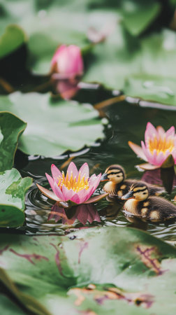 A serene pond with ducklings swimming among blooming pink lotus flowers creating a peaceful natural scene. concept of tranquility, nature beauty, peaceful habitat.