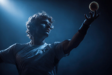 Male tennis player is captured in action, reaching for a ball with intense focus, illuminated by dramatic lighting, emphasizing athleticism and competitive spirit
