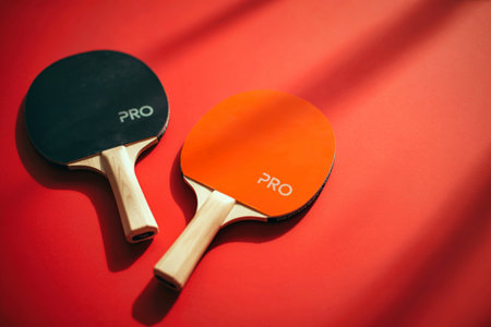 Two brightly colored ping pong paddles, one orange and one dark, rest on a vibrant red surface with dramatic shadows cast across them.