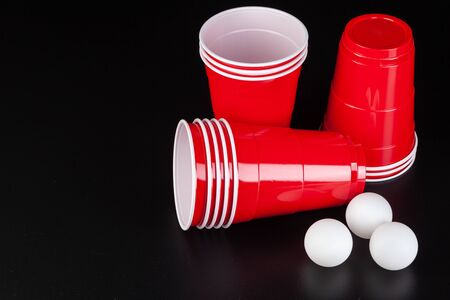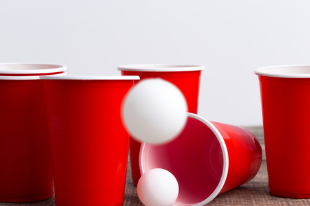 Red plastic cups and ball for game of beer pong