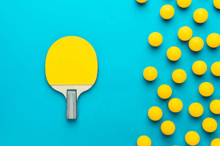 Racket and many balls for table tennis on turquoise blue