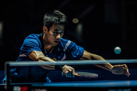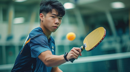 young asian man playing table tennis at night in the sport club