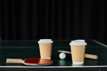 Coffee cups sit alongside table tennis paddles and a ball, creating a lively atmosphere of play.