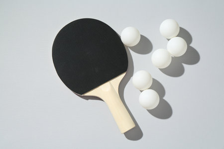 Ping pong racket and ball on light background, top view