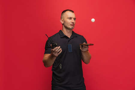 One young caucasian man with ping pong racket and walkie-talkie playing table tennis over red background.