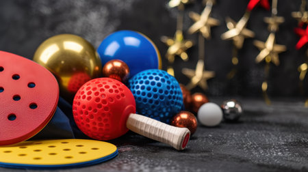 A vibrant collection of colorful balls and a paddle set against a dark background, surrounded by festive decorations, perfect for playful celebrations.