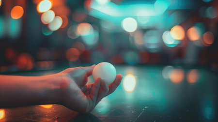 A hand holds a glowing orb, poised for play, with blurred colorful lights in the background