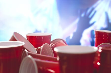 Many red party cups with blurred celebrating people in the background. College alcohol containers in mixed positions. Marketing and promotion for events or beer pong tournament.