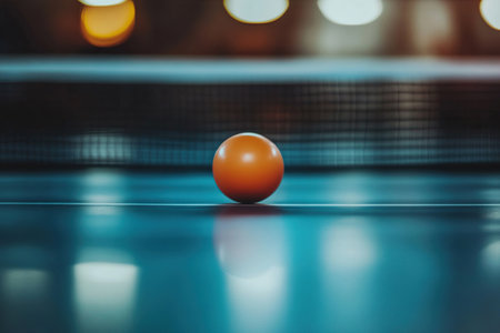 White ping pong ball lies on a blue table with a net. Table tennis blur background.