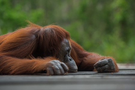 Big sad orangutan lying on a wooden platform in the profile (Borneo / Kalimantan, Indonesia)