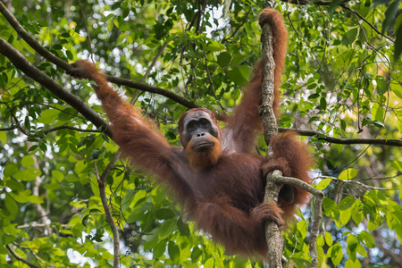 Adult orangutan keeps for a branch paw and looks down (Sumatra, Indonesia)