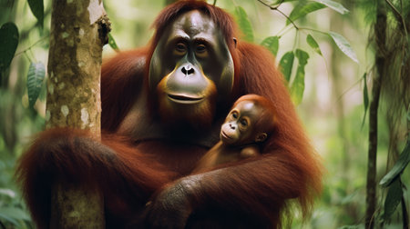 Orangutan mother and child. Illustration Generative AI