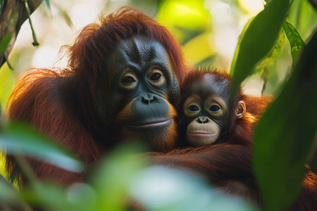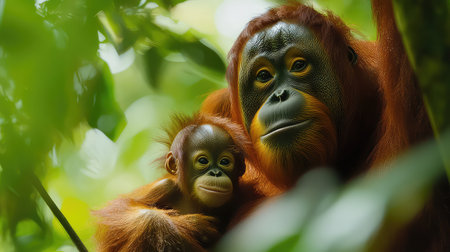 A tender moment captured between a mother orangutan and her baby in a vibrant green jungle. Their gentle expressions highlight the deep bond and love shared in the animal kingdom, showcasing the beauty of wildlife and the importance of conservation efforts.