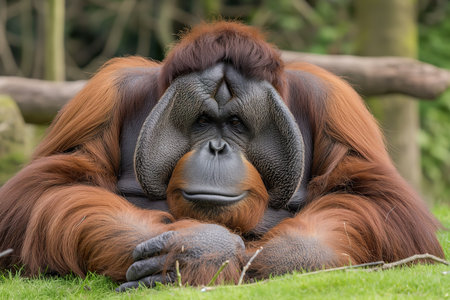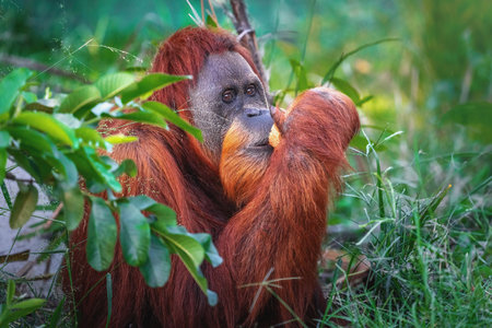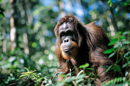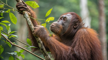 An orangutan in a natural setting, surrounded by greenery, highlighting the importance of wildlife and environmental conservation