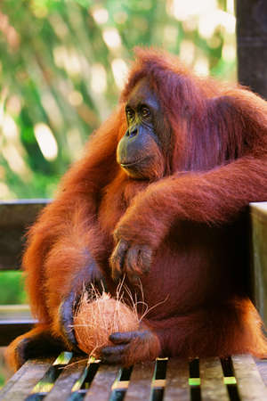 Sumatran Orangutan with coconut (Pongo abelii)