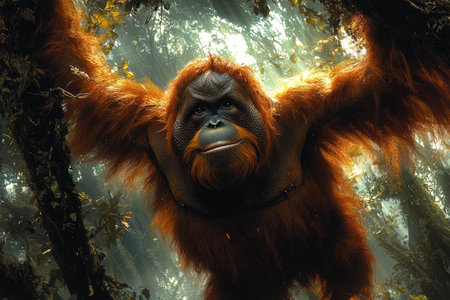 Male orangutan clings to a tree branch, basking in the bright sunlight that filters through the lush green leaves of a tropical forest, showcasing nature's beauty and vitality.
