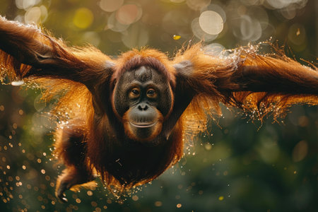 Orangutan swinging on vines in a mystical jungle setting