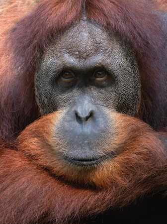 Emotion bewilderment. Smart and kind face of red orangutan close up. Anthropoid portrait