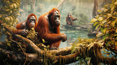 An AI generated illustration of an orangutan perched atop a lush green tree in a tropical jungle