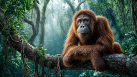 A Bornean orangutan Pongo pygmaeus sitting on a tree branch in a dense tropical rainforest, surrounded by lush greenery and soft light, showcasing its reddish-brown fur and natural habitat.