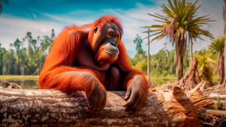 Amidst the desolation caused by deforestation, a melancholic orangutan finds respite on a felled tree, its presence a poignant symbol of the urgent need to protect our forests. Generative AI