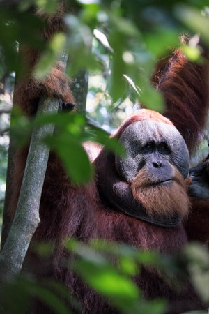 Portrait of male Sumatran orangutan (Pongo abelii) in Gunung Leuser National Park, Sumatra, Indonesia. Sumatran orangutan is endemic to the north of Sumatra and is critically endangered.