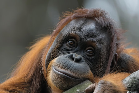 An intense, detailed close-up captures the wisdom and gentle gaze of an orangutan. The rich textures of its fur and skin highlight its primate characteristics and deep connection.