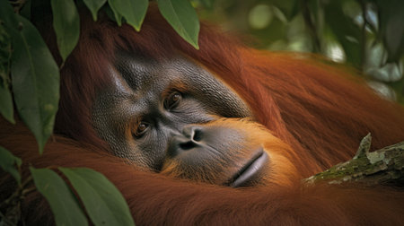An AI generated illustration of A peaceful orangutan resting comfortably on the branch of a tree.