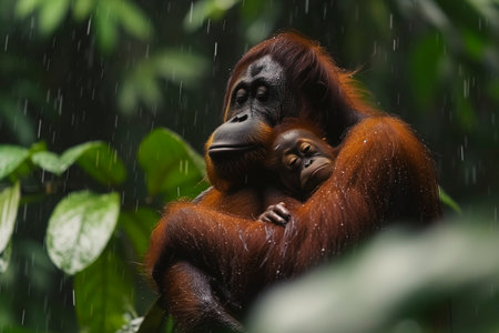 A tender moment unfolds in the heart of the rainforest A mother orangutan cradles her baby, their fur shimmering in soft sunlight that filters through the lush canopy Verdant leaves frame the pair, creating a serene haven in the vibrant jungle AI Generative