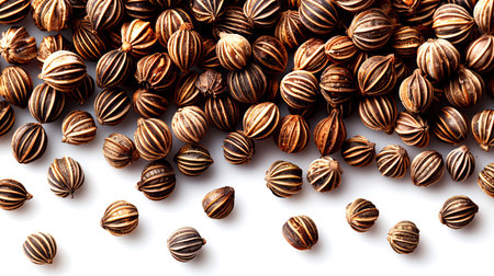 Dry cilantro seeds isolated on white. Food background with copy space. Closeup macro shot. Top view.