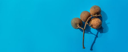 A minimalistic concept image featuring three brown longan fruits on a stem against a vibrant blue background with copy space