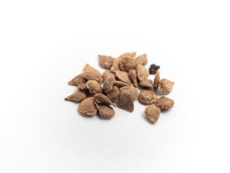 A collection of dried, open seed pods with visible seeds, scattered on a neutral surface.