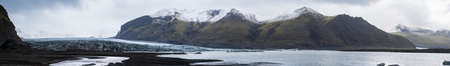 Skaftafellsjökull glacier, Iceland. Glacier tongue slides from the Vatnajökull icecap or Vatna Glacier near subglacial Esjufjöll volcano. Glacial lagoon with blocks of ice and surrounding mountains.
