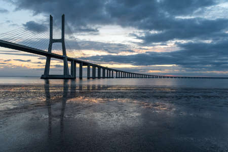 Lisbon bridge. The Vasco da Gama Bridge is a beautiful landmark, and one of the longest bridges in the world. Urban landscape at sunrise. Portugal is an amazing tourist destination.