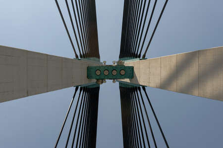 Suspension bridge. Hangers and cable of a suspension bridge isolated on turquoise background. Travel or transportation background photo.