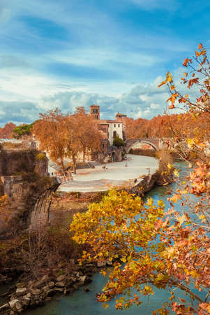 Autumn and foliage in Rome. View of Pons Fabricius with autumnal leavs and Tiber River, built in 62 BC, it's one of the oldest ancient roman bridge still in use