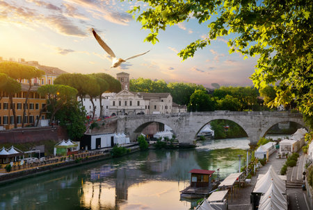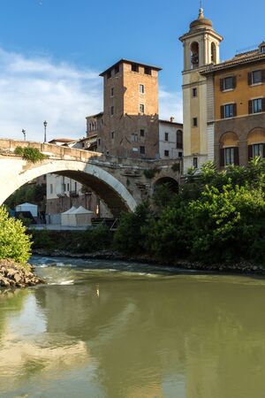 ROME, ITALY - JUNE 22, 2017: Amazing view of Tiber River and Pons Fabricius in city of Rome, Italy