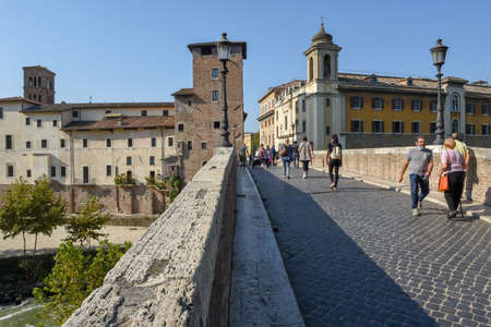 Rome Italy - June 14, 2019: People visit Tiber island Fabricio bridge in Rome Italy