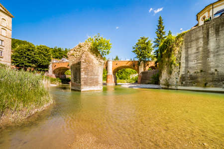 waters of river running around rocky stack and under twelfth century bridge in a small village in the hills in Romagna, Italy
