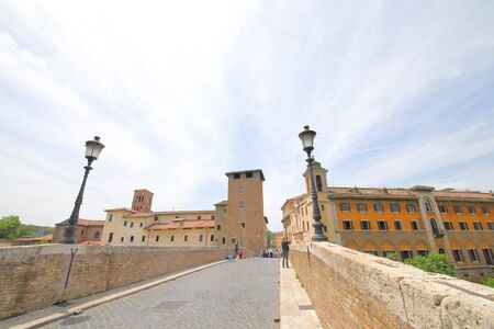 Ponte Fabricio and Isola Tiberina in Rome, Italy. Fabricius Bridge is the oldest Roman bridge in Rome