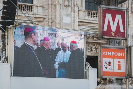MILAN, ITALY - MARCH 25, 2016: A big screen shows the arrival of His Holiness Pope Francis during his first visit in Milan.