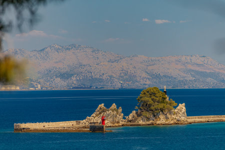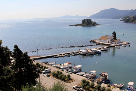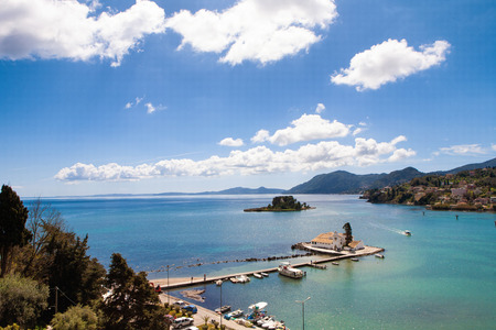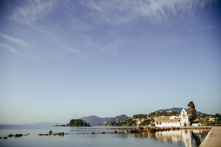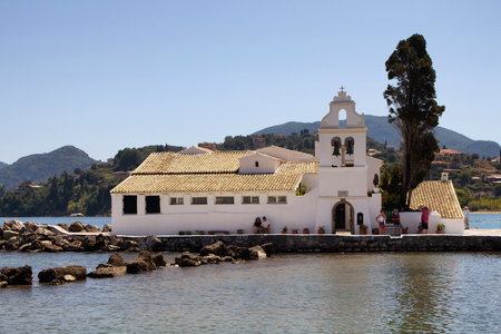 Corfu, Kerkyra view from the coast at the Pantokrator church on the island of Pontikonisi.