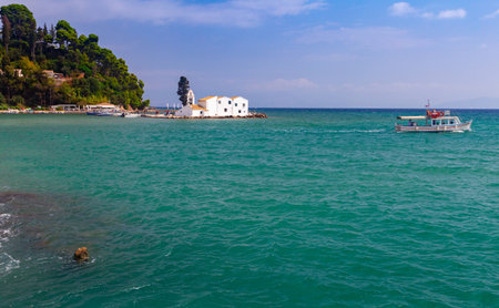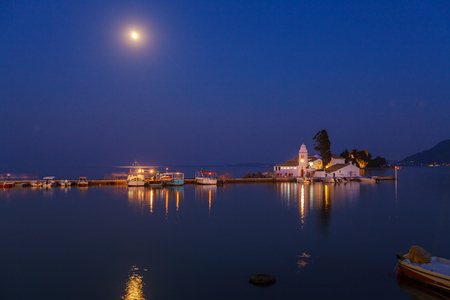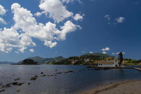 Beautiful landscape with Holy Monastery of Panagia Vlacherna of the coast Ionian Sea in the Corfu or Kerkyra is a Greek island, Europe